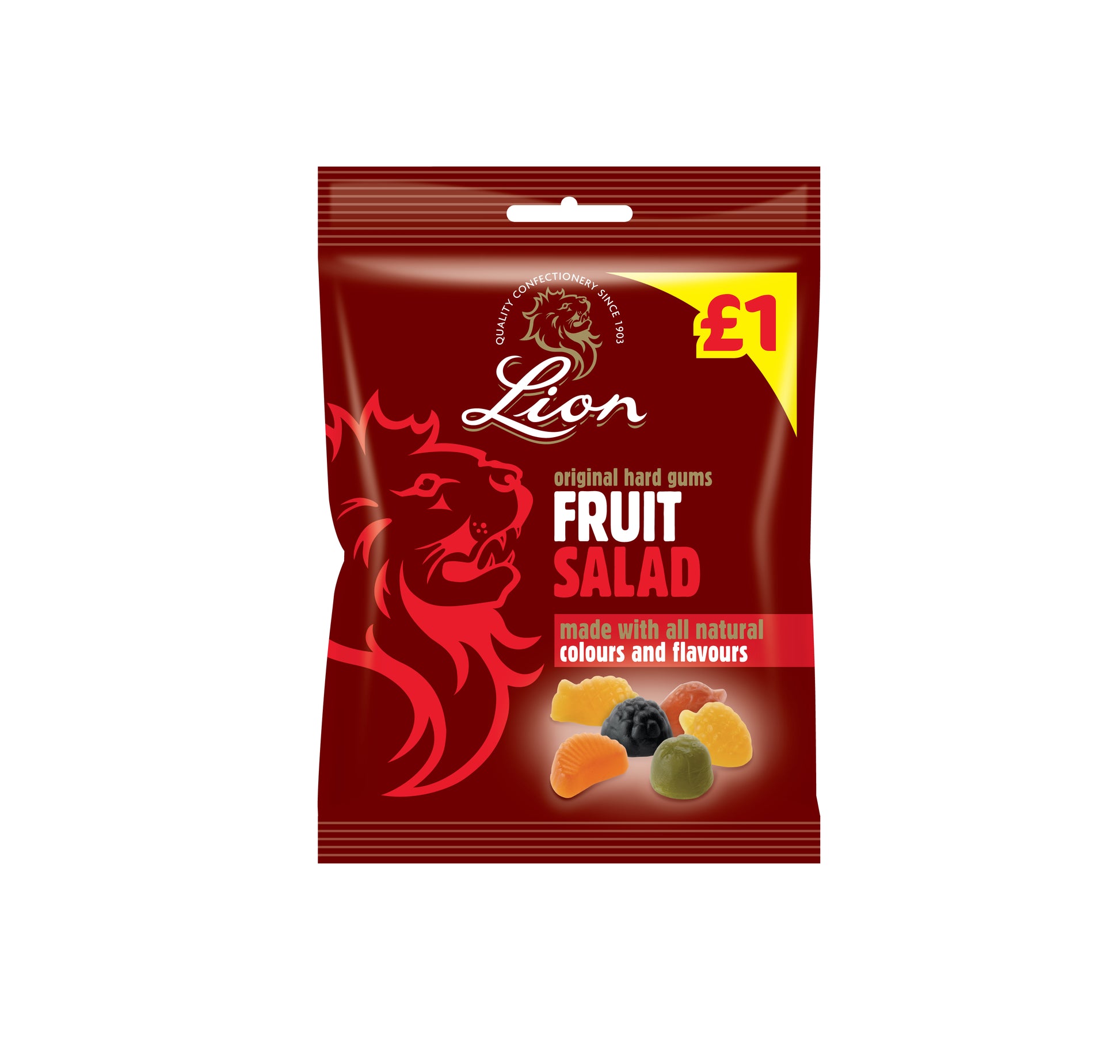 Original fruit salad hard gums Made with all-natural colours and flavours £1 price marked pack 12 x 150g. The original hard gums, Lion Fruit Salad sweets are delicious, fruity and chewy. These classic fruity gums are made with only natural colours and flavours and come in bags of 150g.