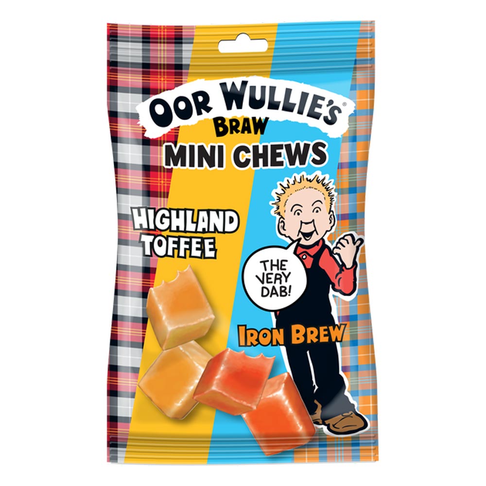 Highland toffee and iron brew flavour mini chew sweets Individually wrapped Perfect for sharing. These delicious chewy sweets are inspired by the iconic wee Scottish laddie Oor Wullie. Since appearing in the Sunday Post over 80 years ago, Oor Wullie has become a much loved part of Scottish Heritage. Each bag contains both highland toffee and iron brew flavour chews, all individually wrapped.