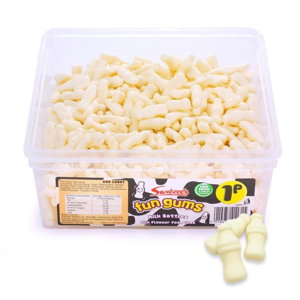 Milk flavour foam gums Sell as part of your penny sweets range Great value tub; 600 pieces. Swizzels Fun Gums are delicious fruit flavour sweets that don't take life to seriously! The range includes all the most popular penny sweets including cola bottles, fried eggs and juicy lips! The Swizzels milk bottles are delicious milk flavour jelly sweets, a classic sweet treat loved by all ages. Sell as part of your 1p sweets range or why not pack into smaller retail bags and boxes to create unique candy mixes.