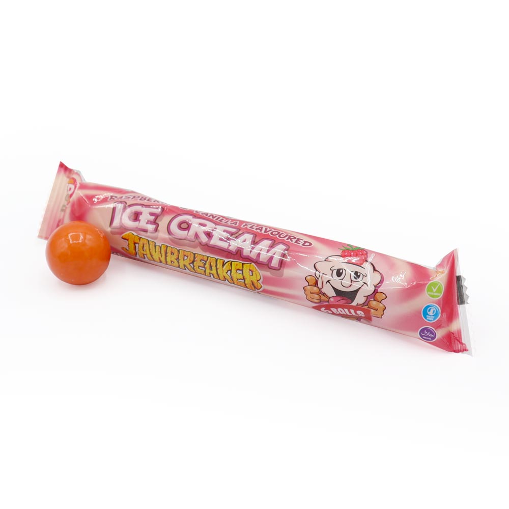 Raspberry & vanilla ice cream flavoured hard candy with a gum centre Perfect pocket money treat 50p price marked box. Share the summer fun with these ice cream flavour Jawbreakers by Zed Candy . Delicious layers of raspberry and vanilla ice cream flavour hard candy with a sweet, chewy bubblegum centre. Each pack holds 6 candy balls and are priced at 50p each, the perfect pocket money treat for younger customers.